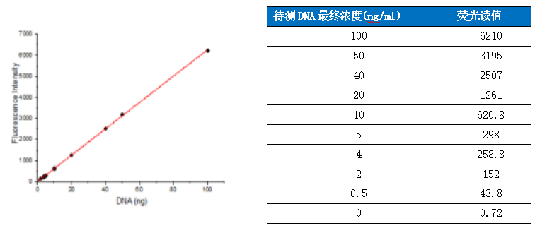 檢測原理:與DNA雙鏈結(jié)合后才發(fā)出的熒光,無DNA不發(fā)熒光;所發(fā)熒光與DNA濃度成正比。Green定量DNA的方法檢出限約0.3ng/ml,DNA含量在1.25-80ng/mL范圍時線性較好(R2>0.99).
