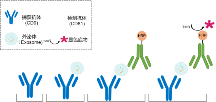 本產品是基于ELISA夾心法用于外泌體定性定量的檢測試劑盒,利用高性能CD9捕獲抗體和CD81檢測抗體可以靈敏地檢測共表達外泌體表面標記的CD9和CD81靶標。本產品可適用于人體體液、細胞培養(yǎng)液等多種樣本,能夠實現(xiàn)對原始樣本中的外泌體進行快速精準定量。