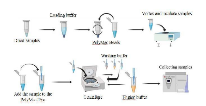 4.將樣品加入 PolyMAC-Tips 中,先20× g 離 心 2 min, 然后100× g 離 心 1min, 確保樣品溶液從 Tips 尖端流出到離心管中。