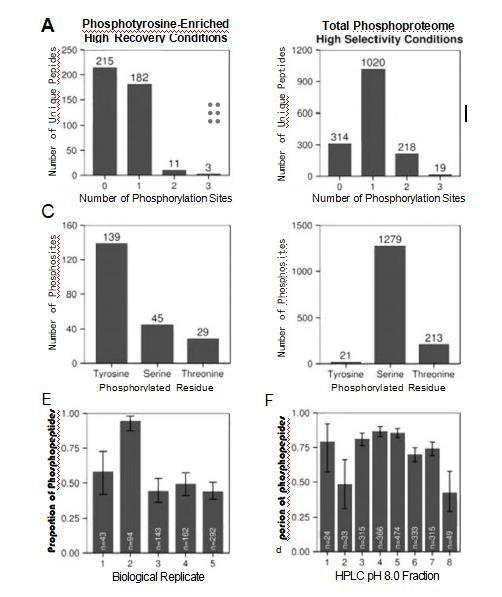 圖 1 .PolyMAC 與磷酸酪氨酸富集(A,C和E)或在PH值為8的RPLC分段進行總磷蛋白組識別(B,D和F)的性能