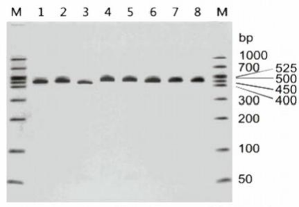不同種類的支原體檢測(cè)條帶大小不同,下圖列出了引起細(xì)胞污染的8大種類常見(jiàn)支原體,若PCR條帶在400bp~600bp范圍內(nèi),均可判斷為支原體污染。也可將PCR產(chǎn)物進(jìn)行TA克隆、測(cè)序進(jìn)一步鑒定支原體的種類。