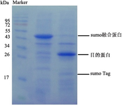 待測融合蛋白100μg,加入TEV Protease 2μl,4℃反應(yīng)16小時(shí),取酶切前后樣品SDS-PAGE檢測,如右圖所示 >90% 融合蛋白被切割。