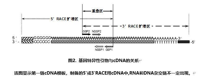 無論是5'-RACE和(或)3'-RACE反應(yīng)都必須要設(shè)計(jì)基因特異性引物(gene-specific primers,GSP),分別命名為GSP1和GSP2。各自的巢式PCR基因特異性引物(NGSP1和NGSP2)可用于RACE產(chǎn)物的分析。在某些情況下,這些巢式的引物也可用于RACE PCR反應(yīng)。第Ⅵ節(jié)中會(huì)詳述引物設(shè)計(jì)的方法。圖2顯示了SUPERSWITCH? RACE反應(yīng)中所使用的引物與其序列來源的相對(duì)關(guān)系。