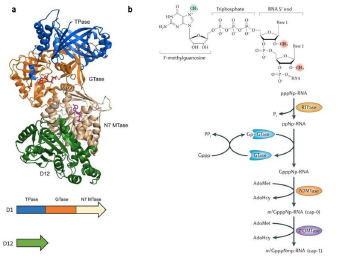 牛痘病毒加帽酶將 7-甲基鳥苷帽結(jié)構(gòu)(m7Gppp,Cap0)加到 RNA 的 5′ 末端。在真核生物中,該結(jié)構(gòu)與 mRNA 的穩(wěn)定、轉(zhuǎn)運(yùn)和翻譯密切相關(guān)。通過酶促反應(yīng)為 RNA 加帽是一種簡單有效的方法,能顯著改善用于體外轉(zhuǎn)錄、轉(zhuǎn)染和顯微注射的RNA的穩(wěn)定性和翻譯能力。這種酶由兩個(gè)亞基(D1 和 D12)組成 (圖 1a),D1 亞基執(zhí)行 RNA 三磷酸酶和鳥苷轉(zhuǎn)移酶的功能,D12亞基執(zhí)行鳥嘌呤甲基轉(zhuǎn)移酶的功能,它們對(duì)于添加一個(gè)完整的 Cap0 結(jié)構(gòu) m7Gppp5′N 都是必須的(圖 1b)。