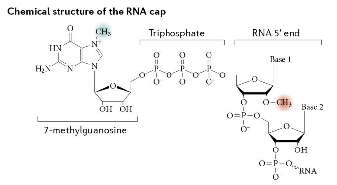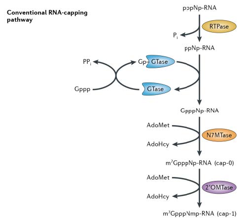 圖1. mRNA 帽結(jié)構(gòu) 2′ -O-甲基轉(zhuǎn)移酶作用機(jī)理。mRNA 的帽結(jié)構(gòu)是由一個7-甲基鳥苷通過一個5′–5′三磷酸酯橋連接到mRNA 鏈的5′核苷上組成。Cap-0 結(jié)構(gòu)由相鄰的 RNA 鏈通過三種酶的依次反應(yīng)形成。進(jìn)一步形成 cap-1 結(jié)構(gòu)需要 2′-O-甲基轉(zhuǎn)移酶的參與,該修飾可以降低 RNA 在體內(nèi)引起的細(xì)胞先天免疫反應(yīng)。本圖引自Decroly, E., Ferron, F., Lescar, J. et al. (2012). Conventional and unconventional mechanisms for capping viral mRNA. Nat Rev Microbiol 10, 51–65.
