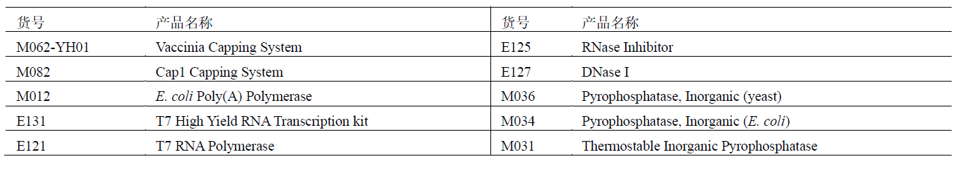 本體系可用于 IVT RNA 的加帽反應(yīng),使加帽反應(yīng)在 1h 之內(nèi)完成,效率接近 100%。IVT 推薦使用近岸蛋白質(zhì) T7 High Yield RNA Transcription kit(貨號:E131)。