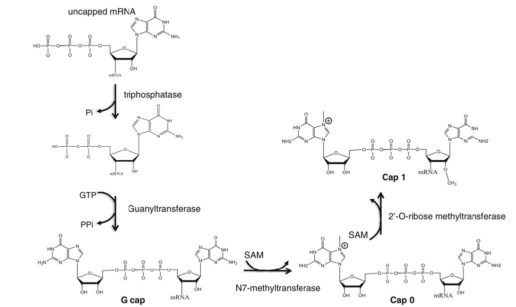 圖1. 參與mRNA 加帽的酶促途徑。Cap 0 結(jié)構(gòu) RNA 的產(chǎn)生需要牛痘病毒加帽酶:該酶兼具三磷酸酶、鳥(niǎo)苷轉(zhuǎn)移酶和鳥(niǎo)嘌呤甲基轉(zhuǎn)移酶的功能。其中S-腺苷甲硫氨酸(SAM)是甲基供體。一旦產(chǎn)生了Cap 0 結(jié)構(gòu),就可以通過(guò)2'-O-核糖甲基轉(zhuǎn)移酶進(jìn)一步修飾以產(chǎn)生Cap 1 結(jié)構(gòu)。本圖引自Michael Beverly , Amy Dell, Parul Parmar, Leslie Houghton et al (2016). Label-free analysis of mRNA capping efficiency using RNase H probes and LC-MS. Anal Bioanal Chem.