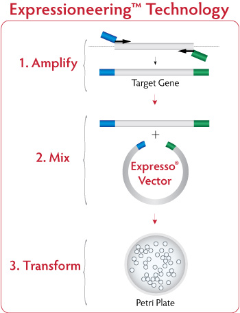 Figure 1. Expressioneering Technology uses in vivo homologous recombination to seamlessly clone PCR amplified DNA into specially designed expression vectors without the need for enzymes or purification steps. The desired insert is simply amplified with primers that include 18 bases that overlap with the ends of the Expresso? vector. The unpurified PCR amplicon is then mixed with the pRham expression plasmid and the high-efficiency competent cells provided, and directly plated on appropriate media.
