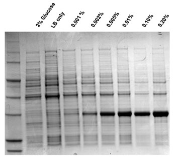 Figure 3. Tuning recombinant protein expression levels with rhamnose induction. The pRham C-His Kan Vector containing a gene encoding a blue fluorescent protein (BFP) was transformed into E. cloni 10G cells. An uninduced starter culture was inoculated to a starting OD600 of 0.8 into culture tubes containing LB media with 30 μg/ml kanamycin and the indicated concentrations of rhamnose (0 to 0.2% w/v) or 2% glucose. After overnight incubation at 37°C, samples were harvested by centrifugation, lysed in SDS-PAGE loading buffer, and analyzed by SDS-PAGE. The Coomassie-blue stained gel shows total cellular protein. Protein expression levels are responsive to rhamnose concentrations between 0.001% and 0.2%.