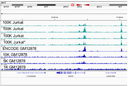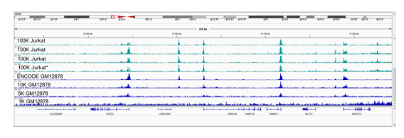 陽(yáng)性對(duì)照試劑(Jurkat細(xì)胞顆粒,H3K9ac抗體和對(duì)照引物集)包含在低細(xì)胞優(yōu)化模塊中,允許用戶在使用任何寶貴的樣本之前熟悉和排除低細(xì)胞ChIP-Seq試劑盒。在檢查染色質(zhì)質(zhì)量和數(shù)量后,可以對(duì)陽(yáng)性對(duì)照樣品進(jìn)行測(cè)序,以確認(rèn)ChIP-Seq峰如預(yù)期出現(xiàn)