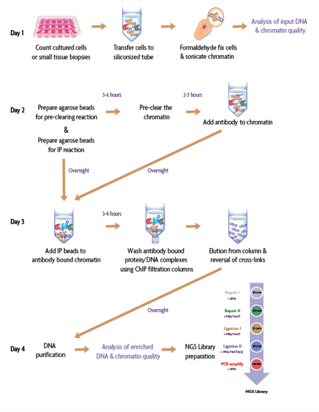 使用Low Cell ChIP-Seq,研究人員可以減少他們正在研究的細(xì)胞數(shù)量,以提高他們對(duì)蛋白質(zhì)- dna相互作用復(fù)雜性的理解,使其適用于更有限的細(xì)胞群。如果樣品數(shù)量有限,難以培養(yǎng)細(xì)胞系,或小組織活檢,該檢測(cè)方法是理想的。在整個(gè)ChIP- seq協(xié)議中,最大限度地保留有限的樣本是很重要的,這就是為什么Active Motif開(kāi)發(fā)了一個(gè)模塊,在工作流程的中間步驟檢查樣本:在染色質(zhì)制備和ChIP富集之后(見(jiàn)下面第1天和第4天的紫色步驟)。