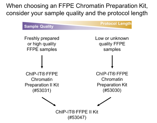 福爾馬林固定石蠟包埋(FFPE)臨床樣本是回顧性研究的寶貴資源。然而,處理FFPE樣本對(duì)ChIP等表觀遺傳學(xué)技術(shù)提出了挑戰(zhàn)。Active Motif利用其表觀遺傳學(xué)專業(yè)知識(shí)開(kāi)發(fā)了市上可用的試劑盒,使FFPE組織的ChIP用于下一代測(cè)序(ChIP- seq)。FFPE ChIP檢測(cè)有兩個(gè)模塊,染色質(zhì)制備試劑盒(根據(jù)樣品質(zhì)量有兩種選擇)和ChIP- it?FFPE II試劑盒(用于進(jìn)行基于ChIP的富集),以允許根據(jù)起始材料的類型和數(shù)量靈活使用。