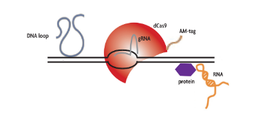 含有20個核苷酸與所需基因組區(qū)域互補的指導(dǎo)RNA (gRNA)與標(biāo)記的酶活性不活躍的Cas9蛋白(dCas9)結(jié)合表達(dá)。gRNA將dCas9蛋白定向到目標(biāo)序列,形成RNA-DNA異雙工。然后使用針對am標(biāo)記的dCas9蛋白的抗體在細(xì)胞上進(jìn)行染色質(zhì)免疫沉淀,以富集由gRNA/dCas9復(fù)合物結(jié)合的基因組序列。