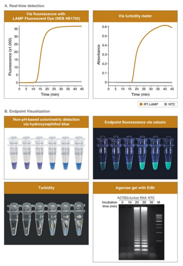 使用 WarmStart 通用 LAMP/RT-LAMP 2X 預(yù)混液(含 UDG)(NEB #M1708)對 RNA 或 DNA 樣品擴(kuò)增,可通過多種實時(A)和終點(diǎn)(B)檢測方法進(jìn)行結(jié)果判定。這些檢測方式包括熒光法、不基于 pH 的變色法(例如:羥基萘酚藍(lán))、濁度法或瓊脂糖凝膠電泳。對于實時熒光檢測,可使用包含 50X LAMP 熒光染料的試劑盒(NEB #E1708),在常規(guī)實時 PCR 儀器的 SYBR?/FAM 通道中進(jìn)行監(jiān)測。