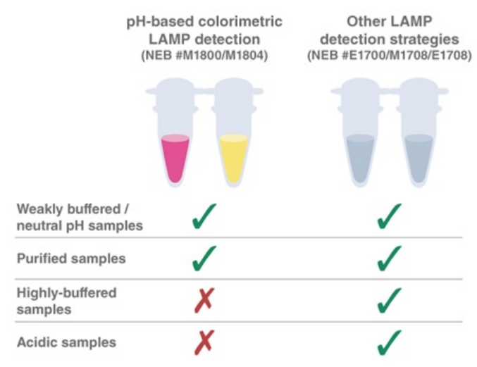 NEB 基于 pH 變化的 WarmStart 變色LAMP/RT-LAMP 2X 預(yù)混液(含/不含 UDG)(NEB #M1804)(NEB# M1800)緩沖力低,因此可使用 pH 敏感染料進(jìn)行可視化擴(kuò)增檢測?;?pH 值改變而產(chǎn)生的顏色變化(如粉紅變黃色)所需緩沖力要低,高緩沖力樣品或酸性樣品可能會影響顏色變化,因此,這種方法限制了檢測樣品的種類。WarmStart 通用 LAMP/RT-LAMP 2X 預(yù)混液(含/不含 UDG)(NEB #M1708,NEB #E1708)(NEB #E1700)是完全緩沖的,可檢測所有樣品類型,適用于多種檢測方法,包括熒光或其它變色染料(例如:羥基萘酚藍(lán))