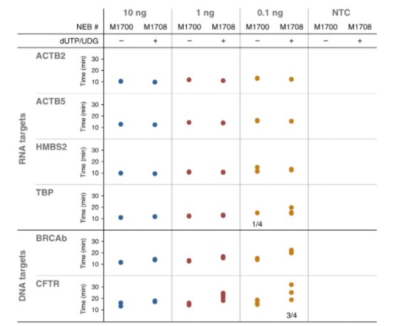 使用 WarmStart 熒光 LAMP/RT-LAMP 2X 預(yù)混液(不含 dUTP/UDG)(NEB #M1700 試劑盒中的組分)和 WarmStart 通用 LAMP/RT-LAMP 2X 預(yù)混液(含 UDG)(NEB #M1708)進(jìn)行 RT-LAMP(RNA 靶標(biāo))或 LAMP(DNA 靶標(biāo))實驗。反應(yīng)加入 1X LAMP 引物和 1X LAMP 熒光染料后,分別加入三個數(shù)量級的 Jurkat RNA 或 Jurkat DNA (10 ng-0.1 ng)和無模板對照(NTC),每個樣品做 4 個重復(fù),形成 25 μl 反應(yīng)體系,置于 96 孔板中 65℃孵育 40 分鐘。使用實時熱循環(huán)儀(Bio-Rad? CFX96)中的 SYBR/FAM 通道進(jìn)行 15 秒一次的熒光檢測。每個點(diǎn)代表熒光信號超過儀器閾值的時間。除了個別說明外,每個樣品都檢測到所有 4 個重復(fù)(注:如果各重復(fù)的檢測時間相似,則檢測點(diǎn)重疊)。總體而言,各樣品檢測結(jié)果顯示:NEB #M1700 和 NEB #M1708 性能一致。無模板對照均無擴(kuò)增。