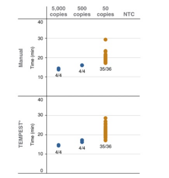 通過手動或 TEMPEST? 自動化液體處理工作站(96 孔,25 μl 反應(yīng))建立針對于合成 SARS-CoV-2 RNA 樣品的 LAMP 檢測體系。檢測樣品為:陽性樣品(人總 RNA 混入 5,000、500 或 50 拷貝的合成 SARS-CoV-2 RNA)或無模板對照(NTCs)。經(jīng) 65℃ 孵育 40 分鐘,使用 1X LAMP 熒光染料在實時熒光儀器(Bio-Rad CFX96)中的 SYBR/FAM 通道檢測。結(jié)果顯示:兩種體系的檢測時間和最低檢出限(LOD)結(jié)果一致。