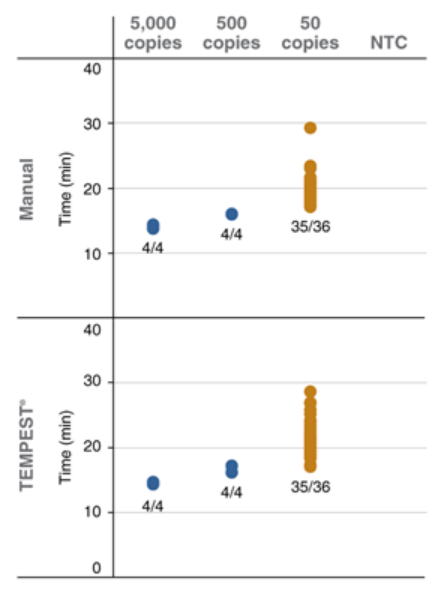 通過手動或 TEMPEST? 自動化液體處理工作站(96 孔,25 μl 反應(yīng))建立針對于合成 SARS-CoV-2 RNA 樣品的 LAMP 檢測體系。檢測樣品為:陽性樣品(人總 RNA 混入 5,000、500 或 50 拷貝的合成 SARS-CoV-2 RNA)或無模板對照(NTCs)。經(jīng) 65℃ 孵育 40 分鐘,使用 1X LAMP 熒光染料在實時熒光儀器(Bio-Rad CFX96)中的 SYBR/FAM 通道檢測。結(jié)果顯示:兩種體系的檢測時間和最低檢出限(LOD)結(jié)果一致。