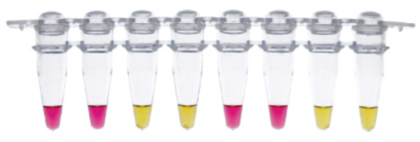 WarmStart Colorimetric LAMP 2X Master Mix 是可視化的 LAMP 和 RT-LAMP 反應混合液(LAMP:環(huán)介導等溫擴增反應)。預混液經(jīng)過優(yōu)化,在特殊 Low-buffer 中含有可視化的 PH 值指示劑及 Bst 2.0 WarmStart DNA 聚合酶 和WarmStart RTx 反轉錄酶。在 LAMP 的反應過程中,DNA 聚合酶發(fā)揮聚合作用,改變質子數(shù)量進而改變 PH 值,使粉色反應液變成黃色,整個反應過程快速,顏色改變清晰,肉眼可見(可以在視頻庫中找到關于 LAMP 實驗以及引物設計概述https://www.neb.com/tools-and-resources/video-library)。該產(chǎn)品可以用于任何 LAMP 或者 RT-LAMP 反應,只需要提供樣品和加熱裝置,在15—40分鐘內就可以用肉眼讀取陽性擴增的結果。
