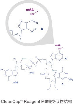 TriLink新推出的CleanCap M6[CleanCap?m6AG(3’OMe)]帽類似物用于mRNA的共轉(zhuǎn)錄加帽,產(chǎn)生Cap 1修飾的mRNA。CleanCap?M6使用與CleanCap?AG和CleanCap? AG(3’OMe)相同的5’AG起始序列,但CleanCap? M6在第一個腺苷第6個位置上增加了一個甲基(m6A),可以進一步增加蛋白表達。有文獻研究(Mauer et al. 2017)可能原理就是臨近7-甲基鳥苷帽子附近的m6A修飾可以通過阻止酶介導(dǎo)的脫帽而保證mRNA的穩(wěn)定性從而進一步增加蛋白表達。CleanCap? M6可與野生型堿基或TriLink的目錄貨號帶修飾的NTPs結(jié)合使用,如N1- Methylpseudouridine-5’-Triphosphate(N-1081), Pseudouridine5’-Triphosphate(N-1019)和5-Methoxyuridine-5’-Triphosphate (N-1093)。
