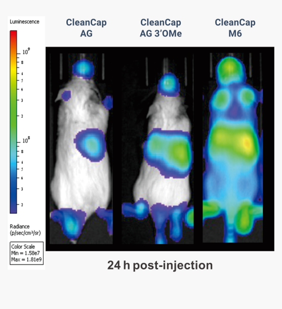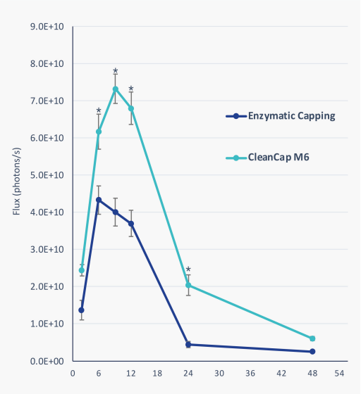 FlucmRNA在LNP遞送系統(tǒng)的尾靜脈注射小鼠模型中的表現(xiàn)。每組1mg/Kg劑量注射后,測量熒光素酶活性,單位為每秒光子數(shù)。組與組之間的差異只有CleanCap?加帽類似物。所有其他變量都受控制。 |