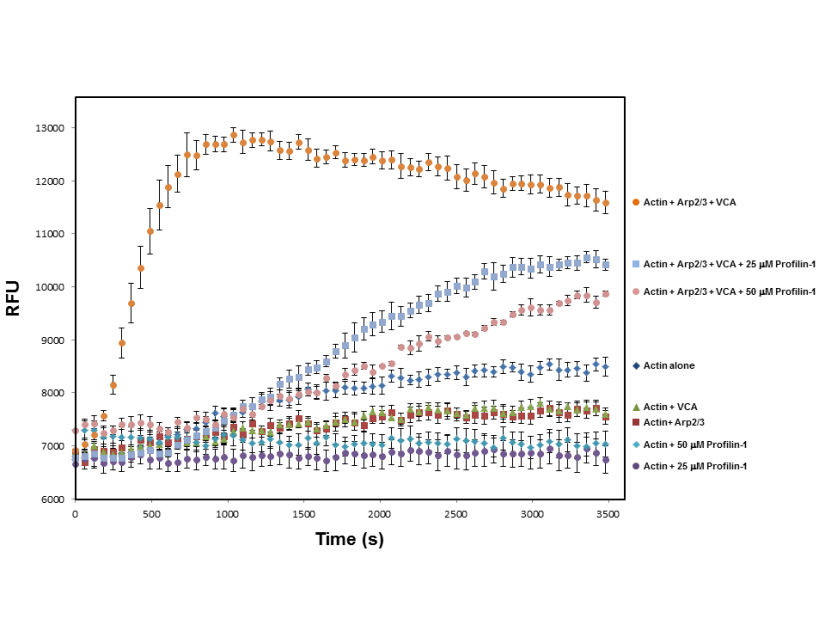 Actin in the presence of both Arp2/3 and VCA shows enhancement of actin nucleation. Upon the addition of Profilin-1, the steep nucleation phase provided by both Arp2/3 and VCA is delayed and greatly reduced. The additionof Profilin-1 to actin also decreases the rate of actin polymerization when compared to actin alone