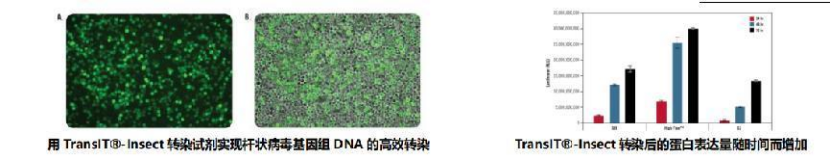 ·TransIT?-Insect Transfection Reagent 昆蟲細(xì)胞專用轉(zhuǎn)染試劑,用于制備高滴度桿狀病毒瞬時(shí)轉(zhuǎn)染和重組桿狀病毒制備是昆蟲細(xì)胞表達(dá)常用方法,TransIT?-Insect 是一款專用于多種昆蟲細(xì)胞系的高效 DNA 轉(zhuǎn)染試劑。