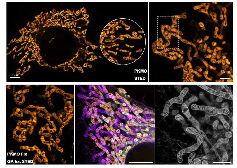 PKMITO??系列的Red、Orange?及Deep Red 具有非常低的化學(xué)毒性、光學(xué)毒性和優(yōu)秀的線粒體定位能力,適用于活細胞線粒體成像。除此之外,此系列產(chǎn)品也已經(jīng)在斑馬魚等小動物實驗中用于線粒體成像。PKMO FX 在細胞經(jīng)醛類固定液固定后依然有高的線粒體熒光保留,適用于固定細胞線粒體成像。綜合這些優(yōu)異的性能,PKMITO??系列產(chǎn)品非常適合用于多種場景下的線粒體成像,尤其在SIM?和STED 等超分辨成像和細胞分選等領(lǐng)域。