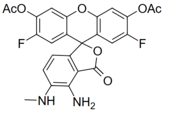 DAF-FM DA即4-Amino-5-Methylamino-2',7'-Difluorofluorescein Diacetate,也稱DAF-FM Diacetate,是最新一代用于一氧化氮(nitric oxide, NO)定量檢測的探針,其檢測原理為:DAF-FM DA可以穿過活細(xì)胞膜(cell-permeable),進(jìn)入細(xì)胞后可以被胞漿內(nèi)的酯酶催化形成不能穿過細(xì)胞膜的DAF-FM。DAF-FM本身僅有很弱的熒光,光量子約0.005,但在與NO反應(yīng)后生成熒光素-苯駢三氮唑(benzotriazole),發(fā)強(qiáng)烈綠色熒光,光量子約0.81。Ex~495 nm,Em~515 nm。任何可以檢測熒光素(fluorescein)的儀器,包括熒光顯微鏡、激光共聚焦顯微鏡、流式細(xì)胞儀、熒光分光光度計(jì)或熒光酶標(biāo)儀都可以用于該熒光探針的檢測。
