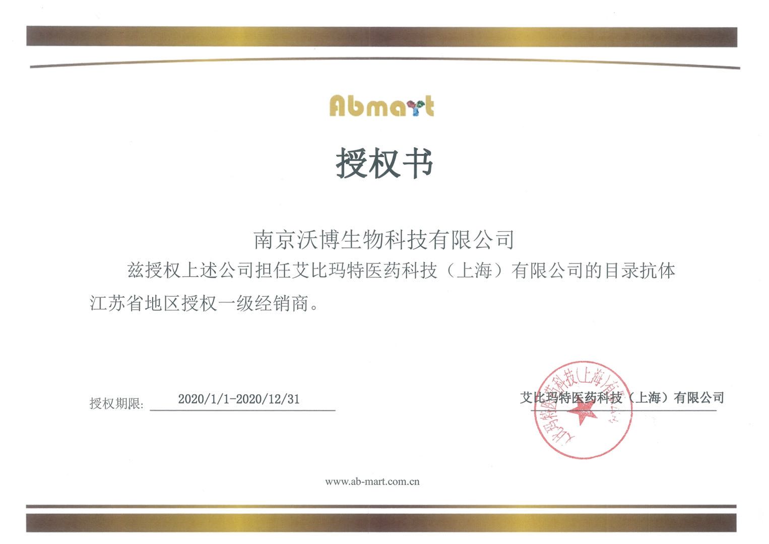 熱烈慶祝南京沃博生物成為Abmart艾比瑪特醫(yī)藥科技(上海)有限公司2020年度江蘇省授權(quán)代理商