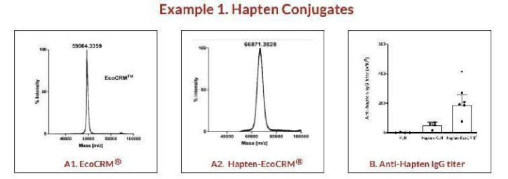 A. MALDI-TOF 法表征載體蛋白和結(jié)合物。與半抗原偶聯(lián)前 (A1) 和偶聯(lián)后 (A2) 分析 EcoCRM? 載體蛋白。使用在高質(zhì)量線(xiàn)性模式下操作的 Applied Biosystems/MDS SCIEX 54800 MALDI TOF/TOF 分析儀分析樣品。