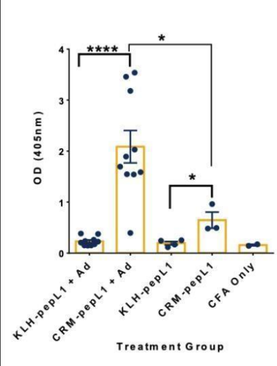 肽 PepL1 與 FinaBio 的即用型結(jié)合物 CRM-馬來(lái)酰亞胺或 KLH(由肽合成公司)結(jié)合。即用型結(jié)合物 CRM-馬來(lái)酰亞胺極大地促進(jìn)了 EcoCRM 結(jié)合物的合成。如圖所示,與 KLH 結(jié)合物相比,CRM 結(jié)合物產(chǎn)生了極好的抗肽抗體應(yīng)答。小鼠在接種疫苗后產(chǎn)生免疫反應(yīng),并用靶向伯克霍爾德菌表面 OMP 的肽-蛋白 +/-佐劑增強(qiáng)免疫反應(yīng)。AddaVax 佐劑 (~MF59)。FinaBio 的 Ready-to-conjugate CRM 對(duì)結(jié)合物的響應(yīng)顯著高于 KLH。還應(yīng)注意,即使不存在佐劑,CRM 結(jié)合物也具有免疫原性。