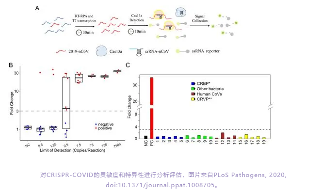 對CRISPR-COVID的靈敏度和特異性進行分析評估,圖片來自PLoS Pathogens, 2020, doi:10.1371/journal.ppat.1008705。對快速篩查和識別COVID-19的需求激增帶來了巨大的診斷挑戰(zhàn)。宏基因組新一代測序(mNGS)和逆轉(zhuǎn)錄PCR(RT-PCR)一直是診斷COVID-19最常用的分子方法,但每種方法都有其局限性。比如,測序成本高,周轉(zhuǎn)時間近一天,而RT-PCR需要專業(yè)設備,難以大規(guī)模部署。缺乏快速準確的分子診斷工具阻礙了公共衛(wèi)生部門對病毒威脅作出高效反應。在這項新的研究中,這些研究人員利用近年來廣泛用于基因編輯的CRISPR技術,開發(fā)了一種替代性的COVID-19測試方法。這種被命名為CRISPR-COVID的測試方法能夠高通量檢測SARS-CoV-2--導致COVID-19的新型冠狀病毒。CRISPR-COVID可在短短40分鐘內(nèi)提供與mNGS相當?shù)撵`敏度和特異性。當大規(guī)模生產(chǎn)時,CRISPR-COVID測試的材料成本可低于70美分,這表明CRISPR-COVID不僅在技術上,而且在財務上也是一個有競爭力的替代方案。這些作者指出,“在這項研究中,我們開發(fā)出一種基于CRISPR的COVID-19等溫診斷方法,具有接近單拷貝的靈敏度。我們展示了一種基于CRISPR的COVID-19測試方法,它提供了更短的周轉(zhuǎn)時間和巨大的診斷價值,即使在資源不足的環(huán)境中也不需要熱循環(huán)儀。”