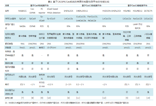 2019年,James課題組提出了一種對傳統(tǒng)材料進行分子編程后用于生物傳感的策略。他們將Cas12a-gRNA復合物嵌入連有單鏈DNA的晶格結(jié)構(gòu)中制成水凝膠[15]。當水凝膠系統(tǒng)暴露于靶標DNA存在的環(huán)境中時,Cas12a被激活,其對周圍單鏈DNA的反式切割使得水凝膠的骨架被剪切破壞,從而造成水凝膠的塌陷。在生物傳感方面,用此策略檢測了葡萄球菌的mecA基因片段,激活的Cas12剪切將淬滅熒光基團連接于凝膠骨架的單鏈DNA,導致熒光信號產(chǎn)生。他們還將水凝膠嵌入微流控紙質(zhì)設備中,開發(fā)了一種可以對埃博拉病毒進行實施快速檢測的試紙條,這種試紙條在實戰(zhàn)中表現(xiàn)出相當好的靈敏度和可重復性。新穎的組合方式使得老材料用了新用法,這種創(chuàng)新的思路可以催生更多新穎的生物傳感策略[16]。表1比較了上述具有代表性的基于CRISPR/Cas系統(tǒng)的病原體檢測分子診斷平臺的性能。