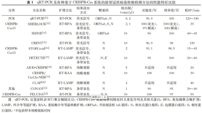 Cas9、Cas3等其他CRISPR-Cas系統(tǒng)雖然沒有反式切割活性,無法實現(xiàn)游離報道分子的信號放大,但利用其靶向結(jié)合的活性同樣可以準(zhǔn)確檢測出SARS-CoV-2的RNA序列?;贑as3操作的核酸檢測方法 (Cas3-operated nucleic acid detection,CONAN) ,最快能在40 min內(nèi)檢測出單拷貝SARS-CoV-2 RNA。Azhar等首次開發(fā)出一種基于CRISPR-Cas9系統(tǒng)檢測SARS-CoV-2的方法FELUDA (FnCas9 editor linked uniform detection assay) ,試劑盒已獲準(zhǔn)在印度上市銷售。該法無需對報告分子進(jìn)行反式切割,直接利用Cas9的酶切作用進(jìn)行核酸檢測,準(zhǔn)確度與qRT-PCR檢測相似,并且在檢測致病性單核苷酸變異和核酸序列分析方面準(zhǔn)確度也很高。表1列出了qRT-PCR以及各種基于CRISPR-Cas系統(tǒng)的SARS-CoV-2核酸檢測方法的性能特征。