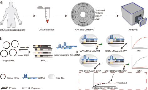 具有致病性線粒體DNA (mtDNA)點(diǎn)突變的患者通常會(huì)出現(xiàn)致殘性神經(jīng)系統(tǒng)綜合征,導(dǎo)致嚴(yán)重殘疾和過(guò)早死亡[1]。至少有1/5000的人口受到mtDNA疾病的影響[2]。線粒體遺傳疾病的單核苷酸多態(tài)性(SNP)通常存在異質(zhì)性[3],即:野生型和突變型共存。突變異質(zhì)率不同的個(gè)體表現(xiàn)出不一樣的臨床癥狀[1]。同質(zhì)的mtDNA突變可以很容易地在血液中檢測(cè)到。然而,對(duì)于異質(zhì)突變,突變mtDNA的百分比水平因組織而異,并且在同一個(gè)體中也可能隨時(shí)間而變化(例如,導(dǎo)致Leber遺傳性視神經(jīng)病變(LHON)的m.11778A>G)。因此SNP異質(zhì)率的精確檢測(cè)對(duì)線粒體遺傳疾病的診斷至關(guān)重要。最近,基于CRISPR的分子診斷技術(shù)因其特異性強(qiáng)、靈敏度高、檢測(cè)速度快等優(yōu)點(diǎn)受到廣泛關(guān)注[4, 5]。例如,巢式RPA和CRISPR/Cas12a輔助病毒鑒定的多重分析平臺(tái)(MAPnavi)被用于快速(< 40分鐘)診斷多種呼吸道病毒[6]。然而,這些單信號(hào)輸出方法難以準(zhǔn)確診斷mtDNA疾病的異質(zhì)性水平,因?yàn)榻Y(jié)果受到樣本中模板總量的影響。與基因組SNP基因分型不同,mtDNA疾病的異質(zhì)性水平診斷需要更準(zhǔn)確的SNP豐度定量,這仍然是一個(gè)挑戰(zhàn)。