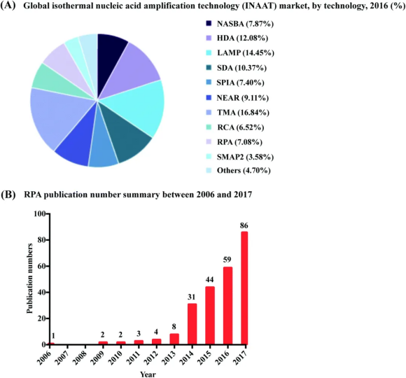 圖1 RPA首次推出以來的市場份額和出版物數(shù)量匯總。(A): RPA在等溫核酸擴(kuò)增技術(shù)中的市場份額百分比。經(jīng)參考文獻(xiàn)7許可轉(zhuǎn)載。版權(quán)所有2018 Grand View Research, Inc. (B):基于web of science收集的數(shù)據(jù),2006 - 2017年RPA出版物編號。