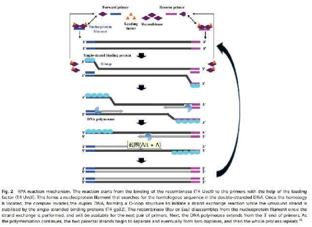 RPA的基本反應(yīng)機(jī)制依賴于對稱為同源重組的自然細(xì)胞過程的綜合工程適應(yīng),這是DNA代謝的關(guān)鍵過程。標(biāo)準(zhǔn)的RPA反應(yīng)試劑包括三個關(guān)鍵蛋白(重組酶、重組酶裝載因子和單鏈結(jié)合蛋白),隨后與輔助成分如脫氧核糖核酸(DNA)聚合酶、擁擠劑、能量/燃料成分(如三磷酸腺苷、ATP)和鹽分子協(xié)調(diào),執(zhí)行RPA反應(yīng)機(jī)制(圖2)詳細(xì)的反應(yīng)組分及其典型濃度和作用