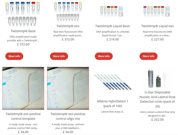 與PCR不同,RPA引物的長度相對較長(建議至少為30個核苷酸,但通常在32至35個核苷酸之間)。較短的PCR引物(通常在18到25個核苷酸之間)也可以用于RPA反應(yīng),但可能會降低反應(yīng)速度和靈敏度。Mayboroda等人、Martorell等人、Wang等人和Fuller等人已經(jīng)證明了短鏈PCR引物在RPA中的應(yīng)用。后兩位作者表明,與PCR相比,RPA中使用的PCR引物具有更高的檢測靈敏度:RPA分別檢測到轉(zhuǎn)基因GTS 40-3-2大豆的100個DNA拷貝和農(nóng)桿菌的3.5 pg基因組DNA,而基準(zhǔn)PCR分別檢測到1000個DNA拷貝和350 pg基因組DNA。