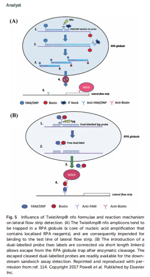 多種下游RPA應(yīng)用(例如側(cè)流條帶檢測和酶聯(lián)免疫吸附測定)的一個重要過程是在RPA反應(yīng)期間將標(biāo)簽納入核酸模板中,以便納入的標(biāo)簽允許捕獲,檢測和/或協(xié)助RPA分析的信號生成。這種核酸標(biāo)記可以末端使用5 '標(biāo)記的引物或內(nèi)部通過標(biāo)記的核苷酸來實(shí)現(xiàn)。39,40,98 - 104用于核酸標(biāo)記的標(biāo)簽可以是熒光實(shí)體(例如熒光素)、配體(例如生物素)或甚至是核苷酸的短片段(懸垂)。大多數(shù)使用RPA的末端核酸標(biāo)記都使用5 '標(biāo)記的正向和反向引物,這樣擴(kuò)增子具有雙重標(biāo)記,可以在下游檢測中被相應(yīng)的識別分子捕獲和檢測。然而,RPA僅通過5 '標(biāo)記過程耐受某些標(biāo)簽。Crannell et al.105報道了5種不同的5 ' -標(biāo)記(Cy5、Cy3、溴脫氧尿嘧啶、四氯熒光素和六氯熒光素)與3種5 ' -標(biāo)記(Alexa Fluor488、熒光素和地高辛)成功結(jié)合的RPA失敗案例。