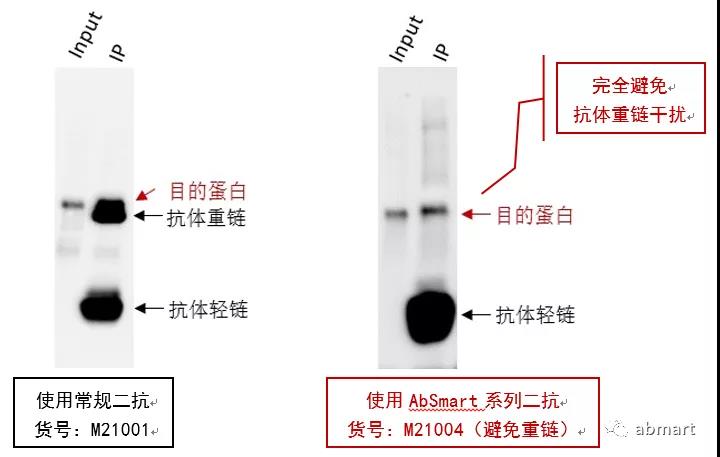 但是絕大多數(shù)一抗是沒有HRP標記的或者共價偶聯(lián)beads的,所以很多實驗室在做內(nèi)源性蛋白Co-IP實驗時就會很煩惱,這時候使用避免抗體輕重鏈的AbSmart系列二抗,就可以有效地解決這類問題,作為內(nèi)源性蛋白的Co-IP實驗的首選。