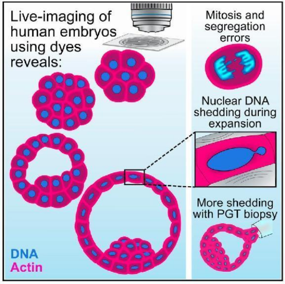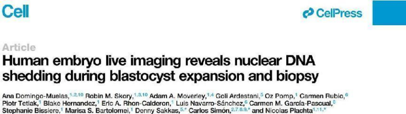 2023年7月5日,美國(guó)賓夕法尼亞大學(xué)Nicolas Plachta研究組與Igenomix基金會(huì)Carlos Simon以及波士頓IVF-Eugin研究組合作在Cell上發(fā)表了文章Human embryo live imaging reveals nuclear DNA shedding during blastocyst expansion and biopsy,通過(guò)結(jié)合熒光染料以及實(shí)時(shí)活體成像揭示人類胚體發(fā)育過(guò)程以及染色體分離動(dòng)力學(xué)特征,同時(shí)發(fā)現(xiàn)了人類胚胎非整倍體的出現(xiàn)源自于染色體分離的錯(cuò)誤以及核DNA脫落。