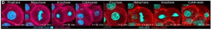 為了創(chuàng)建無(wú)侵入性活體成像,作者們首先在活體胚胎植入前嘗試可透性的熒光染料,其中SPY650-DNA可以用于標(biāo)記基因組DNA,而SPY55-actin用于標(biāo)記肌動(dòng)蛋白,兩種熒光標(biāo)記具有很高的信噪比。此外,細(xì)胞周期持續(xù)時(shí)間、發(fā)育時(shí)間以及囊胚進(jìn)展在熒光染料染色與未染色的胚胎中結(jié)果相似。這些結(jié)果說(shuō)明了SPY650-DNA以及SPY55-actin可透性染料用于活體成像的無(wú)害性。另外,兩種染色染色的結(jié)果與顯微注射組蛋白H2B mRNA H2B-GFP以及肌動(dòng)蛋白Utr-RFP所得到的標(biāo)記結(jié)果類似(圖1)。因而通過(guò)使用高通透性染料作者們實(shí)現(xiàn)了避免遺傳操作進(jìn)行活體胚胎成像的目標(biāo)。