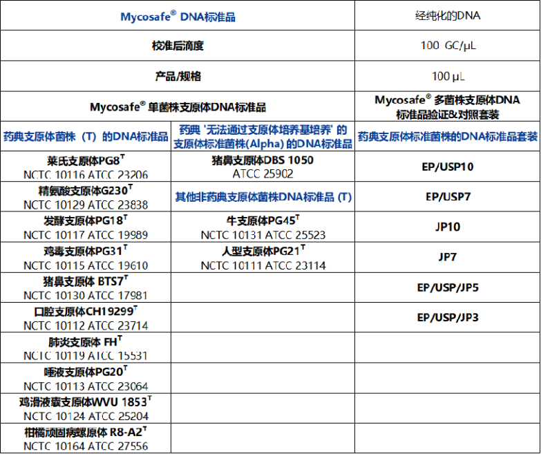 Mycosafe? 滅活支原體培養(yǎng)標(biāo)準(zhǔn)品經(jīng)專門開發(fā),特別適合用于:(?。┰谏逃没蚍巧逃弥гw實(shí)時(shí)PCR檢測(cè)系統(tǒng)(包括培養(yǎng)基富集法/實(shí)時(shí)PCR雜交)的通用和特定產(chǎn)品驗(yàn)證中用作標(biāo)準(zhǔn)品;(ⅱ)與傳統(tǒng)的基于培養(yǎng)法的支原體檢測(cè)方法進(jìn)行比較;(ⅲ)作為常規(guī)支原體檢測(cè)的對(duì)照品。 確認(rèn)與法規(guī)及產(chǎn)品相關(guān)的全部支原體,以確保產(chǎn)品安全Mycosafe? 可提供17種藥典支原體標(biāo)準(zhǔn)菌株和4種與產(chǎn)品相關(guān)的非藥典支原體菌株,它們可代表大多數(shù)在傳統(tǒng)生物制藥和先進(jìn)治療藥物(ATMP)中的基因療法及再生醫(yī)學(xué)中被視為污染物的支原體,其中包含:? 藥典 EP第2.6.7章、USP第<63>章和JP第17版第G3章中所列出的所有10種支原體菌株。? 根據(jù)EP、USP和JP支原體測(cè)試指南,豬鼻支原體(Mycoplasma hyorhinis)α標(biāo)準(zhǔn)菌株DBS 1050,是生物制藥原料進(jìn)行傳統(tǒng)細(xì)胞系培養(yǎng)法所需的供試菌。? 由于該菌株無法在標(biāo)準(zhǔn)支原體培養(yǎng)基中培養(yǎng),因此該重要的菌株標(biāo)準(zhǔn)品無法通過其他方式獲得。? EP第2.6.7章中列出的所有5種EDQM支原體野外分離株。? 符合EP和USP的支原體野外分離株要求的肺炎支原體(Mycoplasma bovis)5167(與Mycoplasma Experience Ltd公司合作提供)。? 如使用牛血清作為生長(zhǎng)培養(yǎng)基補(bǔ)充物,則對(duì)需牛支原體型菌株P(guān)G45T進(jìn)行檢測(cè)。? 對(duì)于血液來源和基于胎盤細(xì)胞的前沿治療藥物,需要使用人型支原體菌株P(guān)G21T和解脲支原體菌株T960T作為供試菌。? 如果生產(chǎn)過程中使用鼠類細(xì)胞系,則推薦使用關(guān)節(jié)炎型支原體菌株P(guān)G6T作為供試菌。 使用科學(xué)準(zhǔn)確且符合法規(guī)要求的支原體標(biāo)準(zhǔn)品進(jìn)行PCR實(shí)時(shí)檢測(cè),以驗(yàn)證方法的適用性和可比性基因拷貝數(shù)(GC)和菌落形成單位(CFU)的相關(guān)性符合法規(guī)要求,每批次的Mycosafe? 標(biāo)準(zhǔn)品的GC / CFU比值低至1~5。