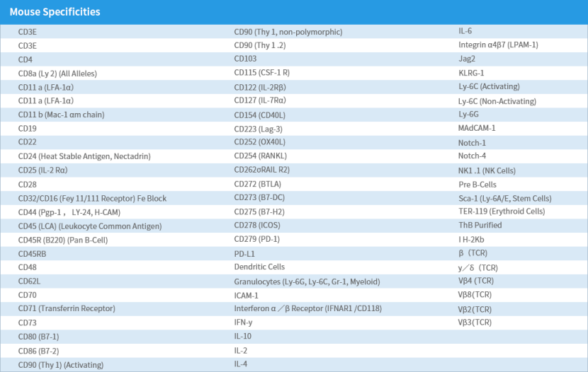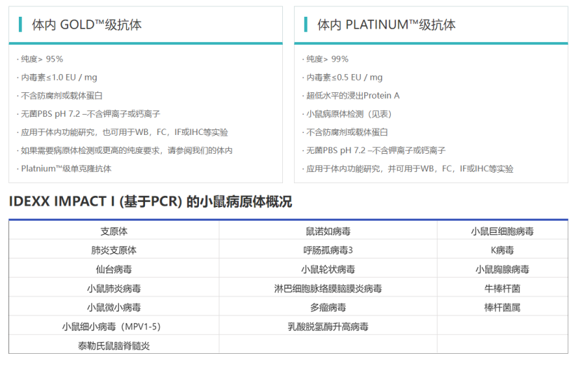 Leinco Technologies通過其特有的制備工藝,生產(chǎn)具有業(yè)內(nèi)最高純度標(biāo)準(zhǔn)的體內(nèi)功能級抗體。其In vivo PLATINUM™級功能抗體對于純度、內(nèi)毒素、聚集體和浸出Protein A水平都有最為嚴(yán)格的質(zhì)控標(biāo)準(zhǔn);此外,In vivo PLATINUM™級抗體均不含病原體,通過了IDEXX Impact I PCR小鼠病原體譜檢測。以其嚴(yán)格的質(zhì)控標(biāo)準(zhǔn)、優(yōu)異的產(chǎn)品性能,Leinco的抗體類產(chǎn)品得到了科研領(lǐng)域及工業(yè)領(lǐng)域的廣泛認(rèn)可,已有大量引用文獻(xiàn)可以參考。