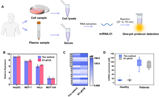 圖6.所示。一鍋法檢測(cè)臨床樣品中miRNA的臨床應(yīng)用。(A)使用RT-qPCR和本方法測(cè)量的人血漿樣品和細(xì)胞樣品中miRNA檢測(cè)步驟示意圖。(B) RT-qPCR檢測(cè)HepG2、MCF-7、HeLa和MCF-10A細(xì)胞系中提取的miRNA-21與該方法在生物傳感中的應(yīng)用比較。(C)使用RT-qPCR和本方法測(cè)量的miRNA-21濃度熒光信號(hào)水平的熱圖。(D)采用該方法(藍(lán)色)和RT-qPCR(黑色)分析患者和健康樣本中miRNA-21的表達(dá)水平。數(shù)據(jù)以均數(shù)±標(biāo)準(zhǔn)差表示(n = 3)。