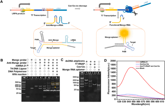 順式切割機(jī)制的應(yīng)用:以往的CRISPR/Cas12a診斷方法多依賴于反式切割進(jìn)行信號(hào)放大,但容易導(dǎo)致假陽(yáng)性。而本文利用Cas12a的順式切割機(jī)制,結(jié)合轉(zhuǎn)錄擴(kuò)增策略,生成功能性Mango RNA,實(shí)現(xiàn)了信號(hào)輸出,避免了反式切割帶來(lái)的假陽(yáng)性問(wèn)題。