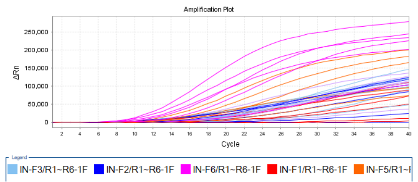 一條探針搭配不同引物的擴(kuò)增效率對(duì)比(上下游引物各6條,36種組合):