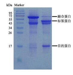 待測(cè)融合蛋白100μg,加入sumo protease 2μl,4℃反應(yīng)16小時(shí),取酶切前后樣品SDS-PAGE檢測(cè),如右圖所示 >90% 融合蛋白被切割。