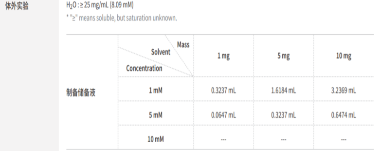 請根據(jù)產(chǎn)品在不同溶劑中的溶解度選擇合適的溶劑配制儲備液;?旦配成溶液,請分裝保存,避免反復(fù)凍融造成的產(chǎn)品失效。儲備液的保存?式和期限:-80°C, 6 months; -20°C, 1 month (sealed storage, away from moisture)。-80°C 儲存時(shí),請?jiān)?6 個(gè)?內(nèi)使?,-20°C 儲存時(shí),請?jiān)?1 個(gè)?內(nèi)使?。